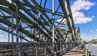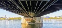 Hohenzollernbrücke is a railway and pedestrian bridge across the River Rhine. It is an iron truss design with an overall length of 409m. Its structure consists of three iron truss arches with a field width of 118, 167 and 122m respectively.