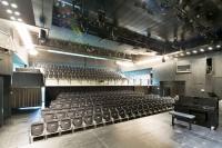 The structure is a large cube with a glass facade opening up toward the forecourt and allowing a glimpse of the foyer in front of the auditorium. This contrasts with the cube outside through its soft rolling shape and all seats provide a good view of the stage.