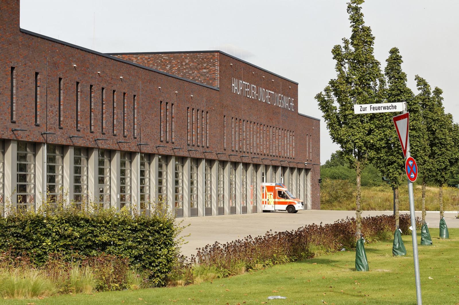 Mit der neuen Hauptfeuer- und Rettungswache hat die Stadt Krefeld ein Gebäudeensemble erhalten, das städtebaulich, funktional und architektonisch überzeugt. Der annähernd H-förmige Gebäudetypus ermöglicht eine präzise Zuordnung der komplexen feuerwehrspezifischen Abläufe und Funktionen. Während die Alarmausfahrt unmittelbar auf die Neue Ritterstraße führt, erfolgt der Anliefer- und Besucherverkehr über eine separate östliche Zufahrt – ein klar strukturiertes Verkehrs- und Einsatzkonzept, das Effizienz und Sicherheit gewährleistet.