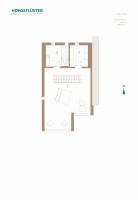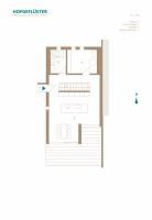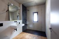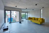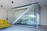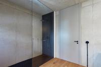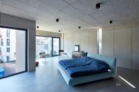 Die innenräumliche Gestaltung folgt einem asketischen, auf das Wesentliche reduzierten Materialkonzept aus Glas und Beton. Sichtbar belassene Betonoberflächen an Wänden und Decken, eine fugenlose, homogen verarbeitete Bodenbeschichtung sowie minimalistische Einbauten und sichtbare Leitungen prägen die Raumwirkung. Die bewusst reduzierte Materialästhetik erzeugt eine klare, nahezu rohe Atmosphäre, die den konstruktiven Charakter des Gebäudes offenlegt und zugleich als Hintergrund für individuelle Anpassungen durch die Bewohner dient. Die hohe thermische Speichermasse der Betonbauteile trägt zur Reduktion von Temperaturschwankungen bei und ist integraler Bestandteil des energetischen Konzepts, das durch eine solarthermische Anlage auf dem Flachdach ergänzt wird. Textile Verschattungselemente an der Südfassade begrenzen den sommerlichen Wärmeeintrag und ermöglichen zugleich eine flexible Regulierung von Sichtbeziehungen und Privatheit.