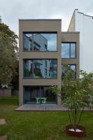Sowohl außen- als auch innenräumlich zeichnet sich das in Sichtbeton ausgeführte Gebäude durch eine reduzierte, geradlinige Formensprache mit präzise positionierten Fensteröffnungen und einer homogenen Außenfassade in Besenstrichputz aus. Zur unmittelbaren Nachbarschaft sind die Fassaden weitgehend geschlossen ausgebildet und verleihen dem Haus durch kleine, rhythmisierte Fensteröffnungen eine gewisse Wehrhaftigkeit. Nach Süden hingegen öffnet sich der Baukörper mit großformatigen Verglasungen zum übrigen Innenhof und orientiert die Aufenthaltsräume zum rückwärtigen Gartenraum. Durch den leichten Vorsprung der südlichen Fassade entsteht ein geschützter Außenbereich, der trotz der dichten städtischen Umgebung eine hohe Aufenthaltsqualität als privater Rückzugsraum bietet.