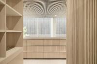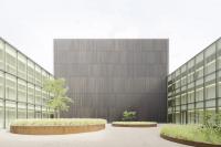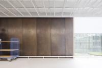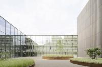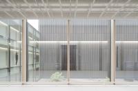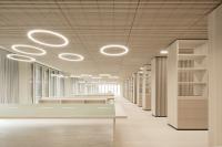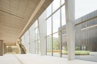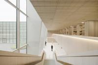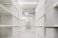 Der Innenraum wird von einem offenen, lichtdurchfluteten Foyer, großzügigen Innenhöfen, einer hochwertigen Ausstattung aus weiß geölter Douglasie und durchdachtem Beleuchtungskonzept bestimmt. Das Zusammenspiel aus hochwertigen Materialien, präzisen Detailausführungen und dem subtilen Einsatz von Tageslicht spricht für den qualitativen Anspruch, der über die Nutzung als Archiv hinausgeht.