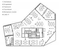 Das straßenseitig geöffnete Erdgeschoss beherbergt repräsentative und öffentliche Funktionen wie ein mehrgeschossiges Foyer, eine Cafeteria sowie flexibel zusammenschaltbare Besprechungs- und Veranstaltungsräume. In den Obergeschossen sind offene Arbeitsflächen sowie geschlossene Arbeits- und Besprechungszonen in unterschiedlichen Konfigurationen organisiert. Die polygonalen Grundrisse mit zentralem Erschließungskern und Sanitärbereich bieten ein hohes Maß an Flexibilität und fördern mehrere Nutzungszonen je Geschoss.