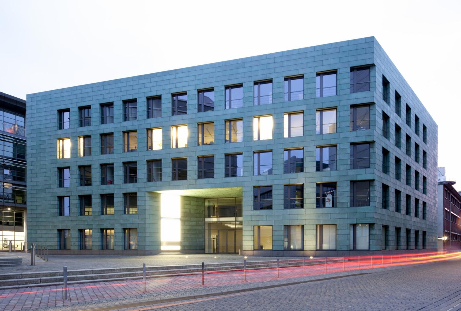 Die Gesamtbaumasse gliedert sich in eine Gesamtüberbauung des Grundstücks im Erdgeschoss mit Ausnahme der Platzfläche, aus der der fünfgeschossige, parallelogrammförmige Hauptbaukörper und ein kleinerer dreigeschossiger Dreieckskörper zum Zollhof hin herauswachsen. Die Höhe des Dreiecks orientiert sich an der Nachbarbebauung, an deren Giebelwand angebaut wurde.