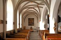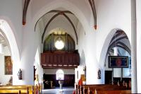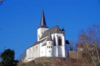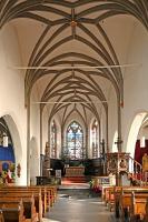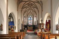 Der heutige Bau ist eine dreischiffige Hallenkirche des ausgehenden Mittelalters, ursprünglich dem Heiligen Kreuz geweiht. Bis 1489 bestand vermutlich lediglich ein zweischiffiger Bau mit Holzdach. Der südöstlich vorgelagerte Rundturm diente zunächst als Zugang zum Wehrgang der äußeren Mauer der Burgsiedlung und belegt die wehrhafte Prägung des Ortes.
