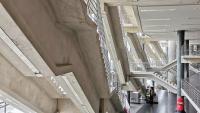 Die städtebauliche Einbindung der Kölnarena in das Ensemble des umgebenden zeitgleich entstandenen Stadthauses ist von einer klaren Rahmungsidee geprägt: Die beiden langgestreckten Verwaltungsflügel umfassen die Arena nahezu hufeisenförmig und lassen sie dadurch als zentralen Solitär hervortreten. Während das Plateau als gemeinsames Podest beide Bauwerke miteinander verbindet, übernimmt das Stadthaus zugleich die Funktion eines architektonischen Hintergrunds, das die Arena betont und zugleich maßstäblich einfasst. Auf diese Weise wird die Arena nicht isoliert, sondern bewusst in ein größeres Gefüge eingebettet, das Verwaltung, Großveranstaltung und Stadtraum miteinander verzahnt.