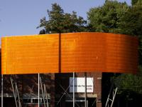 Olaf Metzels 1999 entstandene Reflexionswand vor der Landesfeuerwehrschule Münster besteht aus Hunderten orangefarbener Prismenreflektoren, die je nach Licht und Perspektive ein ständig wechselndes Schimmern erzeugen und damit Wahrnehmung und Raum in Bewegung versetzen. Als visuelles Signal zwischen Reklametafel, Straßenbild und Feuerwehrkontext verbindet die Installation Alltagsmaterial, Standortbezug und künstlerische Reflexion zu einem eindrucksvollen Kommentar über Kunst im öffentlichen Raum.