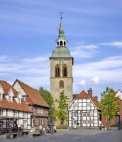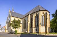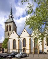 Die dreijochoge Hallenkirche besteht aus Bruchstein, der an einigen Stellen verputzt wurde. Sie setzt sich aus einem dreischiffigen Langhaus, einem Westturm mit neubarocker Turmhaube, einem Querhaus und einem Chor mit 7/10 Schluss zusammen. Die Seitenschiffe werden von Quersatteldächern gedeckt und von Maßwerkfenstern durchbrochen. An die nördliche Seite des Chors fügt sich der zweigeschossige Anbau der Sakristei an und an den östlichen Wänden des Querhauses befinden sich kleine Apsiden. Zur Kirchenausstattung gehören unter anderem ein Marienaltar aus dem Jahr 1642 aus Stein, das Sakramentshaus aus dem Jahr 1504, der Taufstein von 1500 und die Kanzel, die Moritz von Amelunxen gestiftet wurde. Die Kreuzigungsgruppe im Chor wurde 1887 von Christoph Siebe geschaffen.