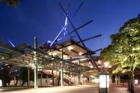 Diese Haltestelle bildet mit ihrer aufsehenerregenden Architektur, die an die chaotische Anhäufung von Trümmern erinnert, eine Landmarke innerhalb der umgebenden Konsumarchitektur.