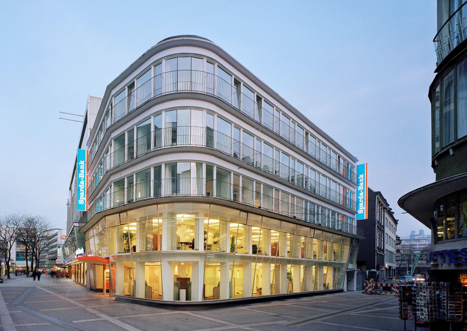 Charakteristisch für das Gebäude ist die weitgehend verglaste Fassade mit großformatigen Scheiben, die dem ehemaligen Geschäftshaus den Beinamen „Großvitrine“ einbrachte. Die beiden unteren Geschosse werden durch leicht geneigte, geschossübergreifende Verglasungen optisch zusammengefasst und überhöht, wodurch die Stahlskelett-Konstruktion vom Straßenraum ablesbar ist. Die drei darüberliegenden Regelgeschosse mit bodentiefen Fensterbändern werden durch umlaufende Balkone mit filigranen Brüstungsgittern gegliedert und folgen der abgerundeten und leicht abknickenden Gebäudeecke, die den Straßenverlauf aufnimmt: Während die Bankstraße eine gerade Bauflucht vorgibt, folgt die Herzogstraße einem leichten Knick. Der Haupteingang wird durch ein weit auskragendes Betondach auf schlanken Rundstützen betont und führt in einen trapezförmigen Eingangsbereich mit anschließendem Foyer, dessen Boden ein Mosaik des Wuppertaler Künstlers Ernst Oberhoff schmückt. Das Haupttreppenhaus mit Aufzug liegt am südlichen Ende der Bankstraße und erschließt alle Geschosse.